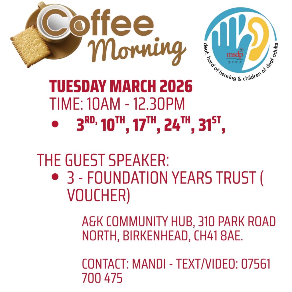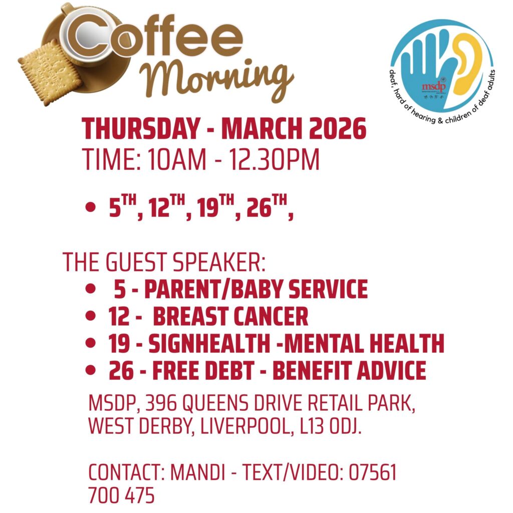 Contact Mandi on 07561 700 475 for more information. You can also find upcoming events and our latest news on the MSDP Facebook page: facebook.com/MerseysideSocietyForDeafPeople